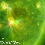 The source region of a moderately fast CME (projected to the plane of the sky speed of 556 km/sec; http://spaceweather.gmu.edu/seeds/mkmovie_ql.php?cme=20170714.013612.w109.v0556.p251&frame=5). Note the interesting "rapture" of connectivity with smaller AR 12666.