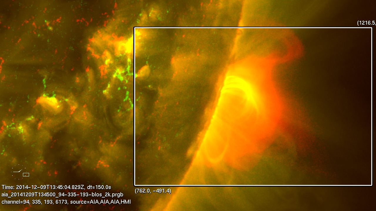 Description: This eruption immediately follows another eruption (http://lmsal.com/hek/her?cmd=view-voevent&ivorn=ivo://helio-informatics.org/ERMET_MarkCheung_20141212_194039) from the same region behind the limb. The 193 (yellow) channel shows twisted field structure rising through the corona and out of the AIA field of view. Hot arcade loops (94, red) are left in its wake. As the bright front of the arcade propagates outward, sunward propagating voids (tadpoles) can be seen interleaving the fuzzy arcade.