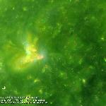 A small, compact brightening indicative of UV bursts near the polarity inversion line AR12733. There appears to be a small material flow emanating from a location adjacent to the burst.