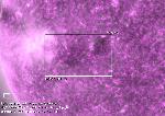 A narrow width coronal hole extending a large range of heliographic longitudes. Note that the coronal hole seems to be trailing behind a decaying active region (not catalogued by NOAA).