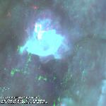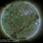 A large trans-Equatorial coronal hole system extending from near the south polar coronal hole and stretching towards the northwest. It appears fragmented i.e. with non-uniform intensity along its length. Note the narrow width of this system.