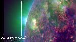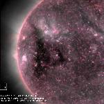 A transequatorial coronal hole in the E hemisphere of the sun. Coronal holes are areas of decreased plasma emission above areas of unipolar magnetic field (consider as one of the sources of solar wind)