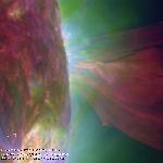 A horizontal loop structure (yellow, 171) lifts off from the south pole, carrying with it some cool prominence material (red, 304 A). Most of the prominence mass falls back, and there is considerable dyanmiscs and side-way flows in the prominence.