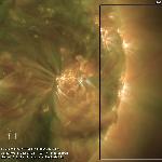 The erupting loop is most clearly seen in 171 A images followed by dimming in the coronal volume in 211 A images. In 304 A images, the filament is seen to erupt, consisting of at least two strands.