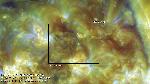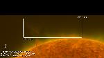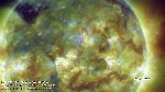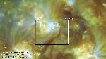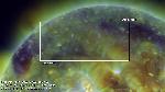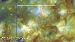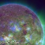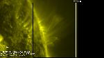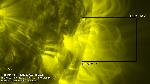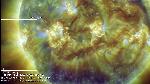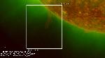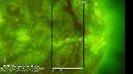 A region east of central meridian erupts (with ribbons and a mainly southward propagating perturbation seen best in the loops projecting onto the southern polar cap). Note that a filament activation in the region leading it (just west of CM) also exhibits a simultaneous activation, while a region approaching the W limb does also, all timed to within about 6 min. of each other.