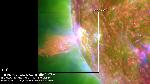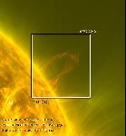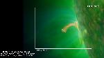 An impulsive surge of absorbing material (304, orange) emanates from a compact source near the solar surface. This excites a coronal wave (as can be seen in the swaying of loops off the limb).