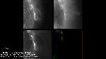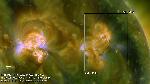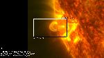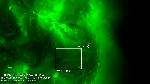 A close-up 304A view to one of the coupled eruptions annotated earlier. The movie shows the liftoff of the sigmoid (or a sigmoidal portion of a larger filament) and two large blobs dark in 304A flying away in the eastward direction.