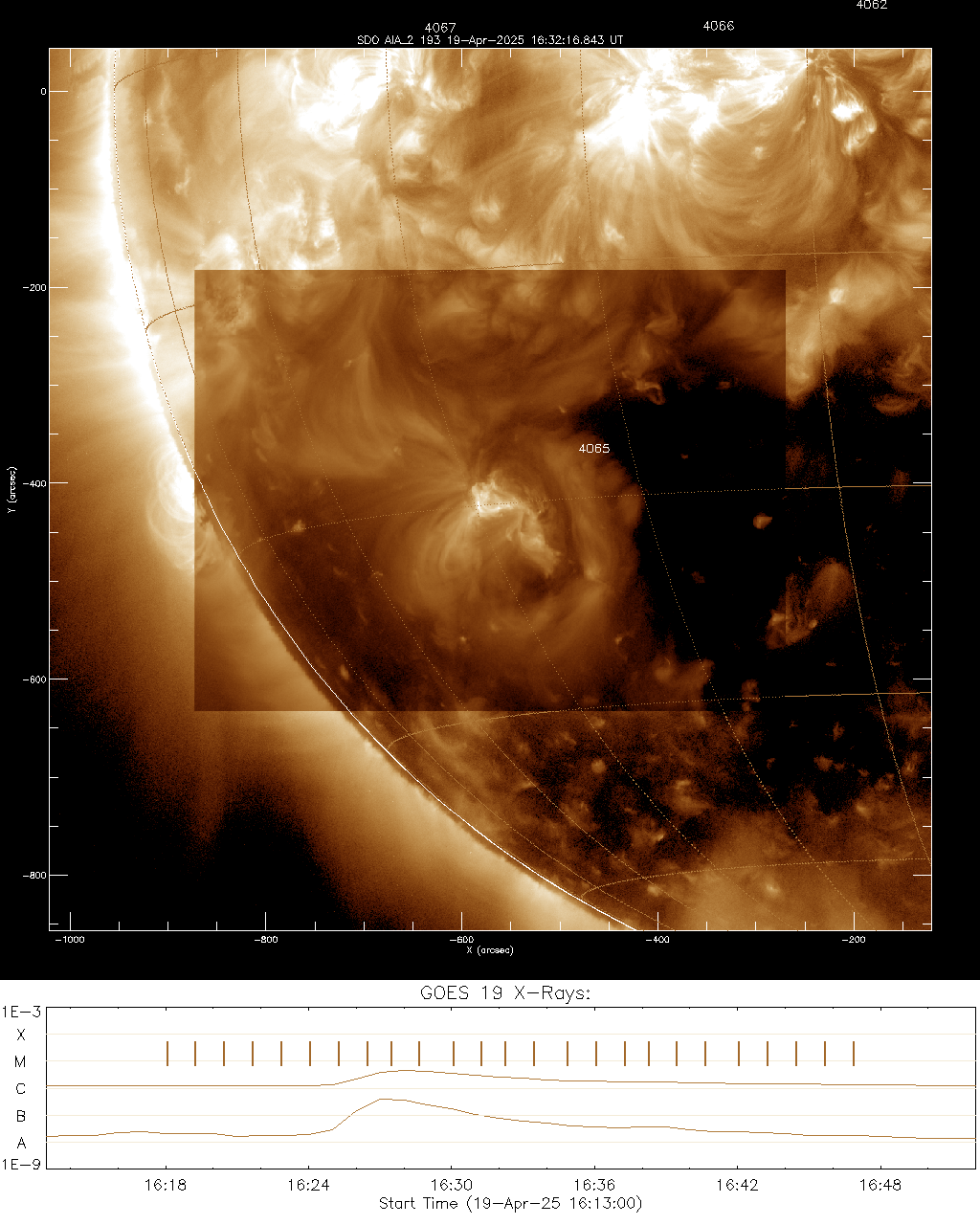 FL - Flare 2025-04-19T16:23:00 -> 2025-04-19T16:32:00 xcen, ycen = -565.637922,-421.545738